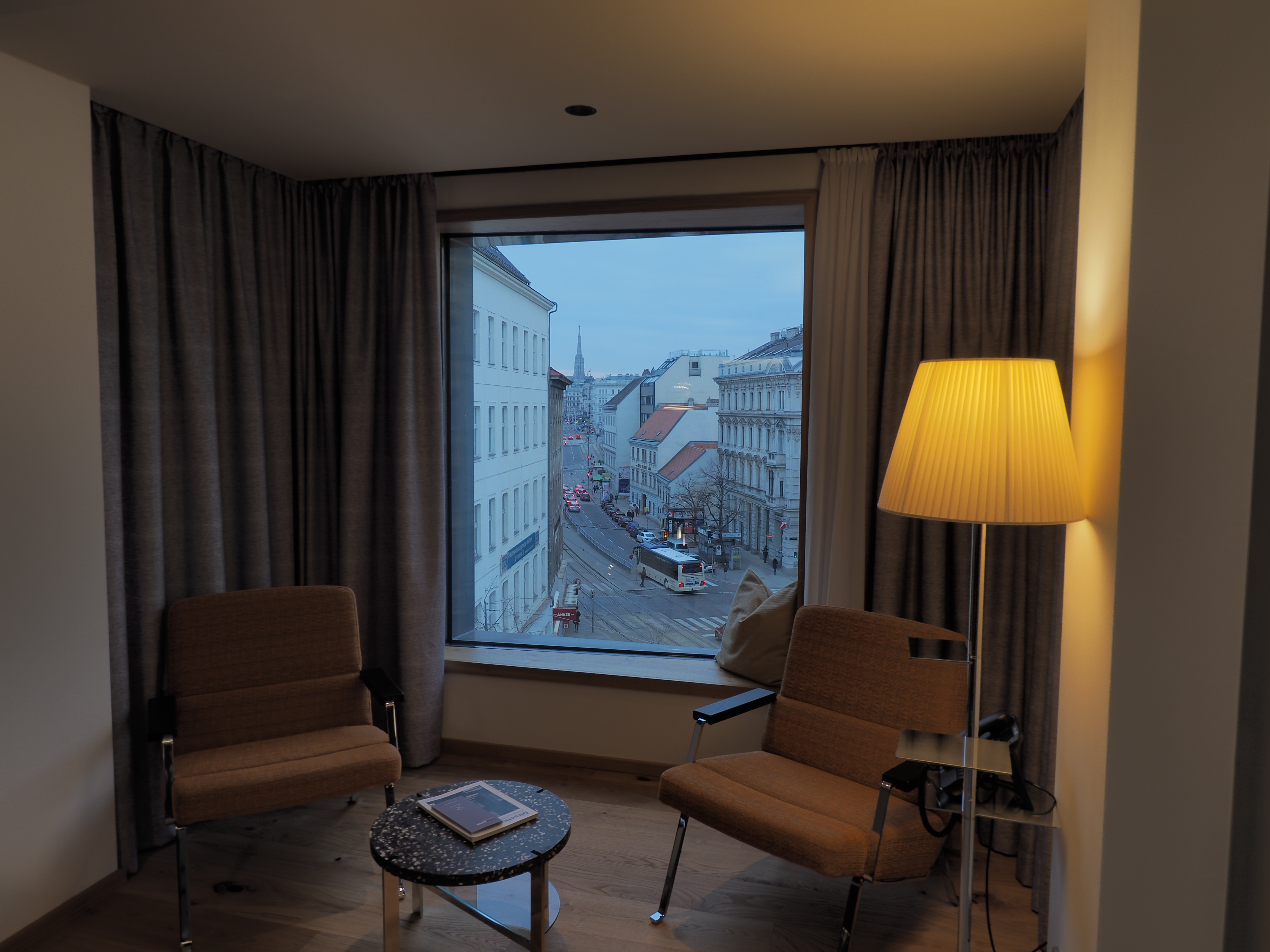 Bei den Suiten gibt es mehrere mit Balkon, einige davon sogar mit einem direkten Blick auf die Kärntner Straße und den Stephansdom, eines sogar mit einer Lesekoje mit Panoramafenster. Die größte Suite liegt allerdings zum Hof hin und verfügt über einen eigenen – übrigens beeindruckend ruhigen – Dachgarten.